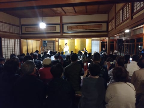 そして18時30分。狩野泰一さんの登場です。大広間の畳廊下を篠笛を吹きながらの登場。