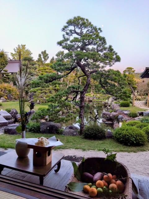 松の右上に小さく見える十三夜の月(令和7年11月2日/旧藏内邸大広間より)十三夜は、十五夜に次いで美しいとされる月を愛でる日本の伝統的風習です。別名「栗名月」「豆名月」とも呼ばれ、秋の収穫への感謝や翌年の豊作を願う意味合いがあります。