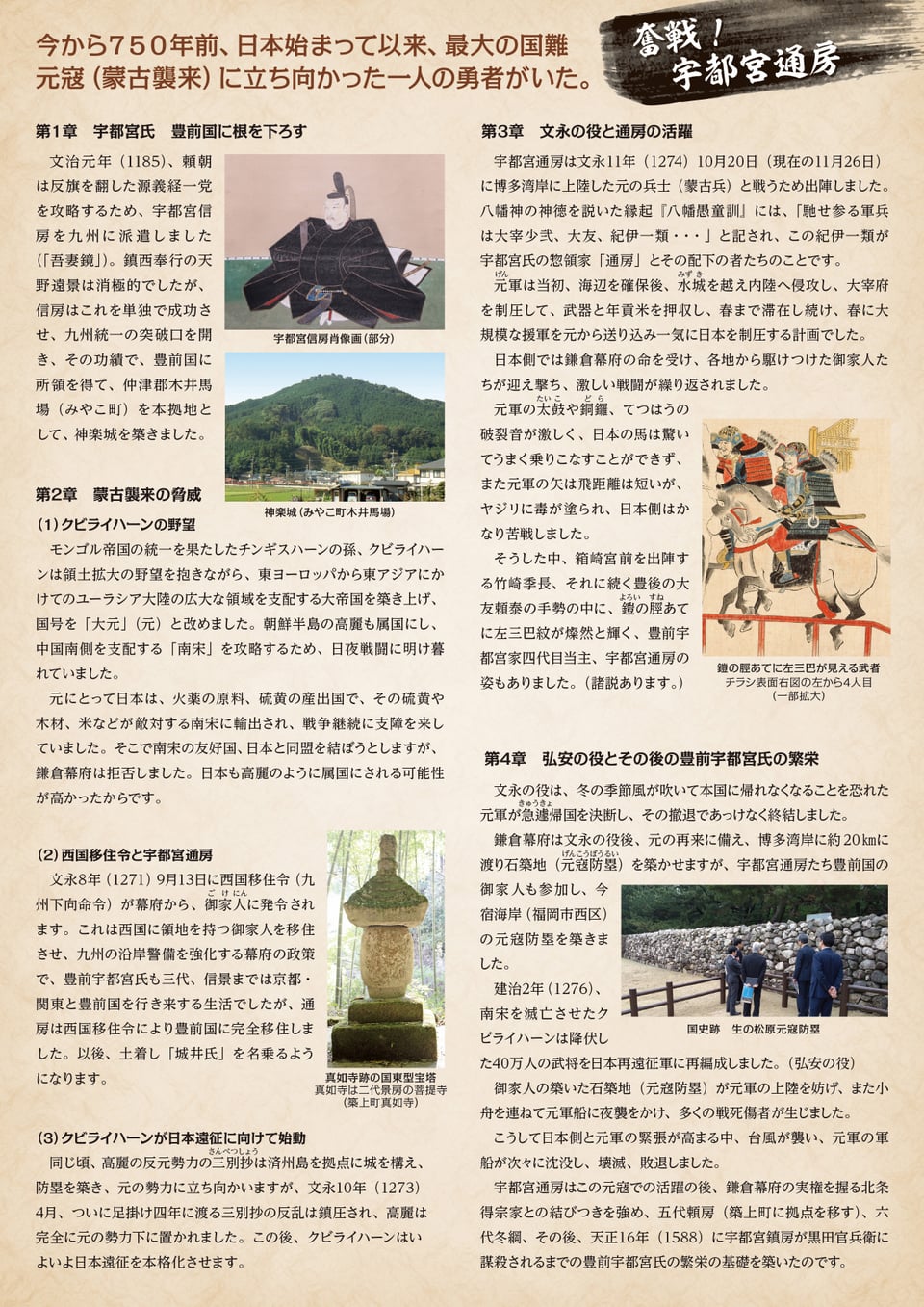 力し、その後400年続く豊前宇都宮氏の最盛期を築いた人物です。蒙古襲来から750年、宇都宮通房の活躍を振り返