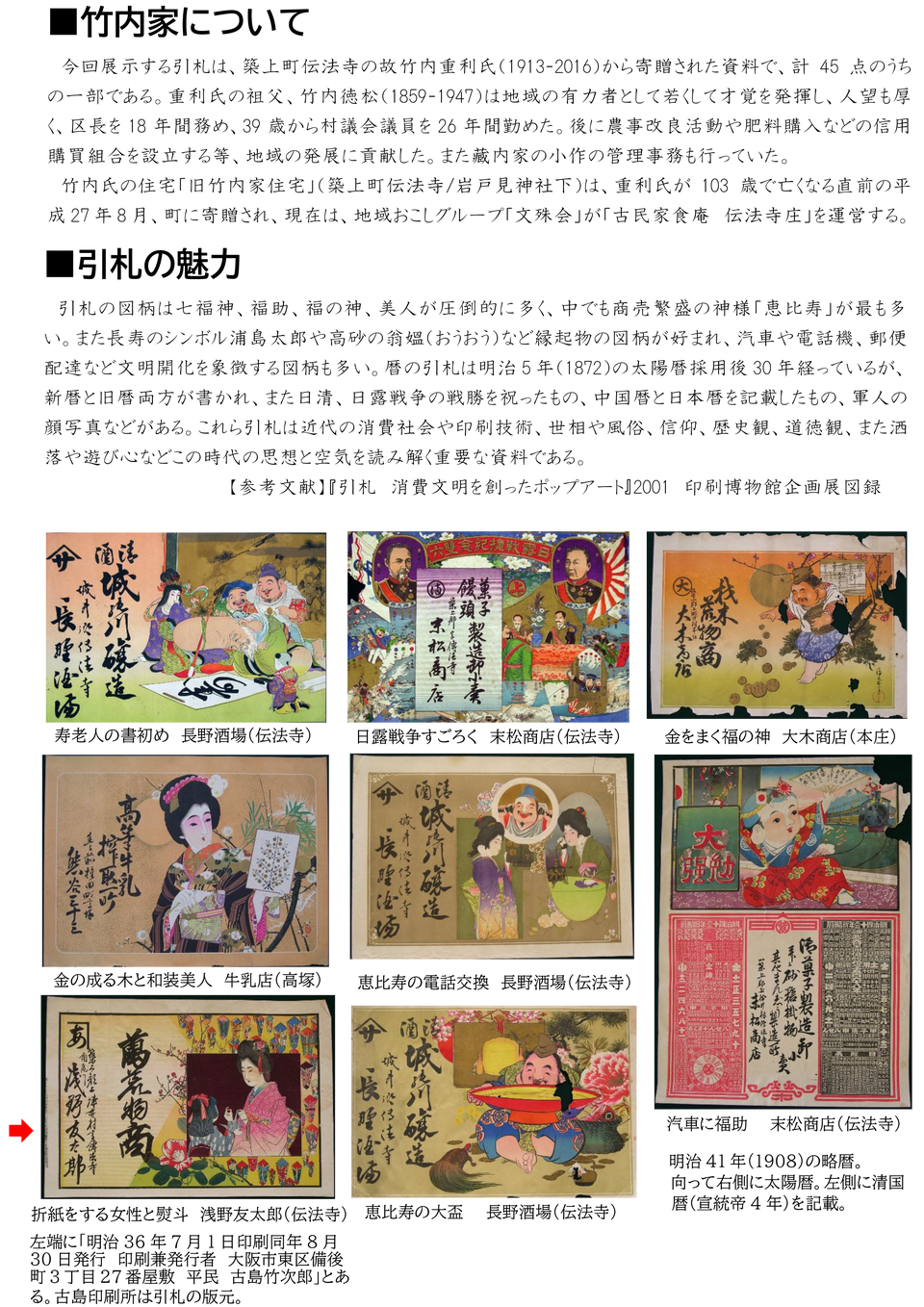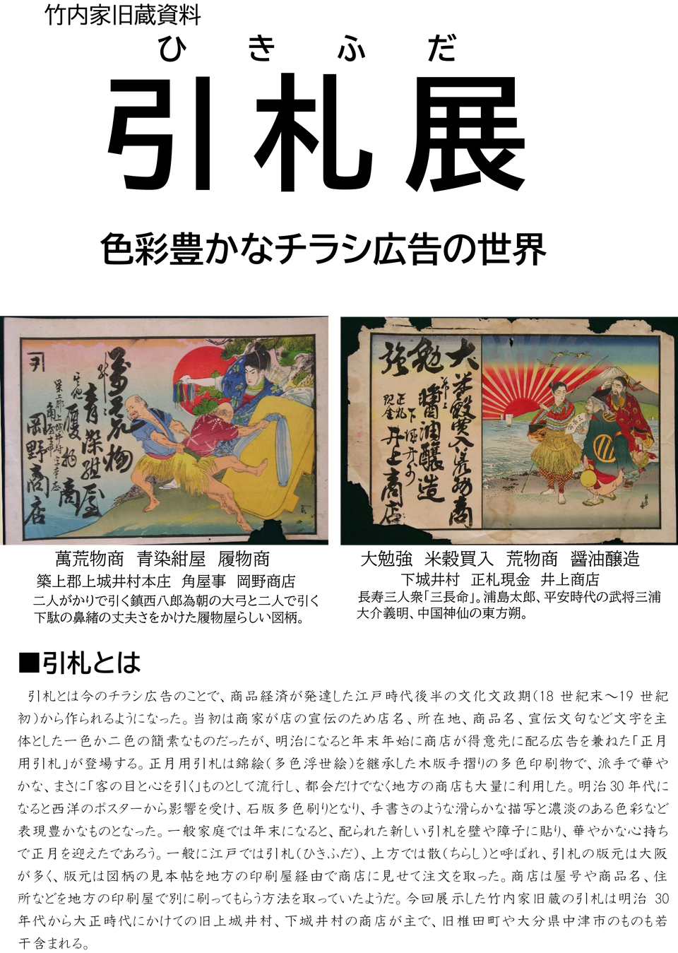 明治時代から大正時代に町内の商店が配ったチラシ広告「引札」を展示します。木版や石版で印刷された独特の色合いと大胆な図柄をお楽しみください。